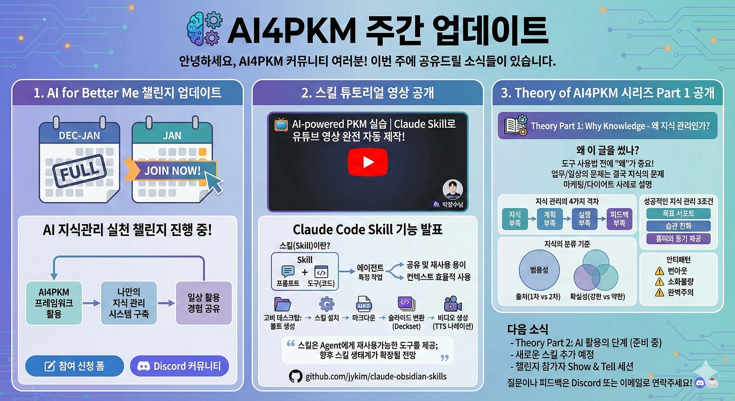 안녕하세요, AI4PKM 커뮤니티 여러분! 이번 주도 커뮤니티 챌린지 / 스킬 업데이트 / PKM 이론 강의 등의 소식을 전합니다. 추운 날씨에 건강 조심하시고요~